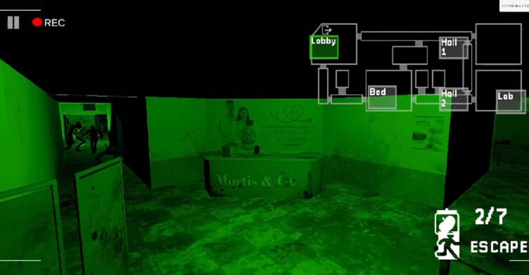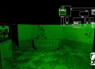 Player 2 takes on the role of a camera operator with access to night vision security cameras located around the facility. The players will need to communicate through in-game voice comms to locate valuable organ jars and safely navigate around the facility.